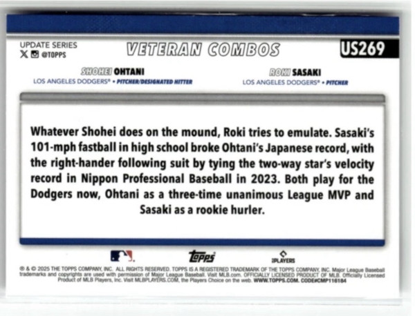 2025 Topps Update Series - Veteran Combos Shohei Ohtani, Roki Sasaki #US269 (RC)