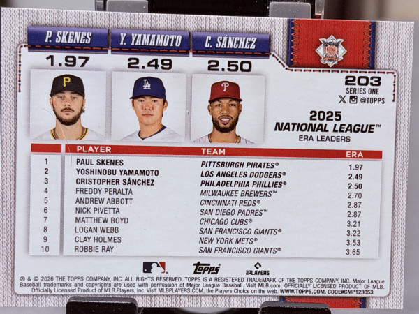 2026 Skenes YamamotoSanchez Topps Series One #203 NL ERA Leaders