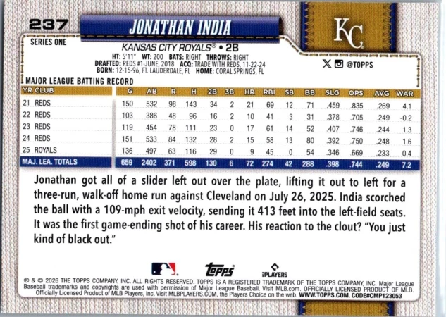 This is a nice example of a 2026 Topps #237 Jonathan India Spring Training