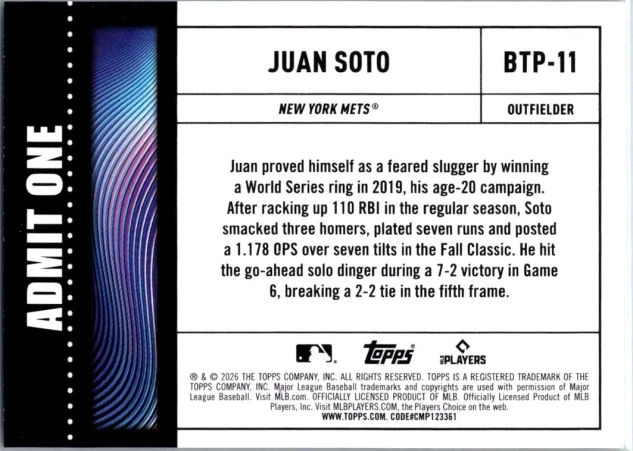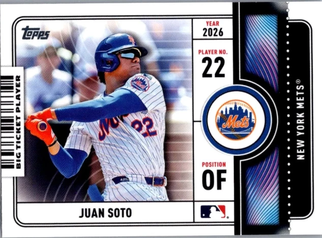This is a nice example of a 2026 Topps #BTP-11 Juan Soto Big Ticket Players