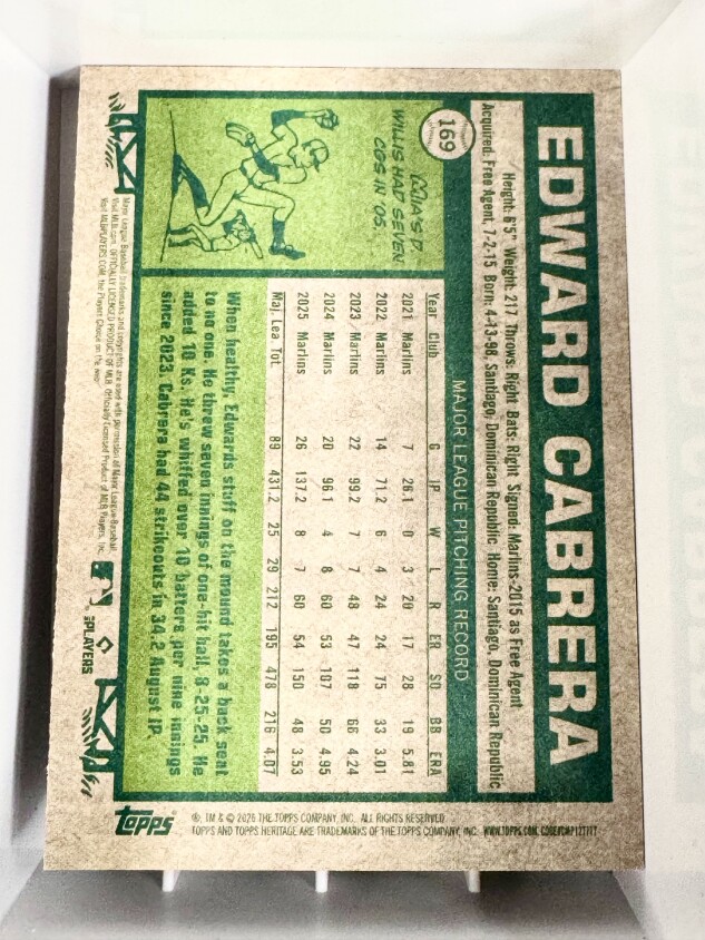 You are purchasing a 2026 Topps Heritage Edward Cabrera #169. You will receive the exact item in the photographs. Thank you for looking.