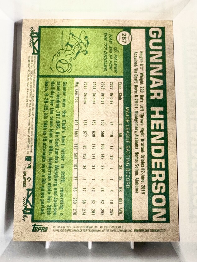 You are purchasing a 2026 Topps Heritage Gunnar Henderson #287. You will receive the exact item in the photographs. Thank you for looking.