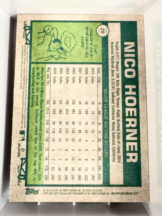 You are purchasing a 2026 Topps Heritage Nico Hoerner #28. You will receive the exact item in the photographs. Thank you for looking.