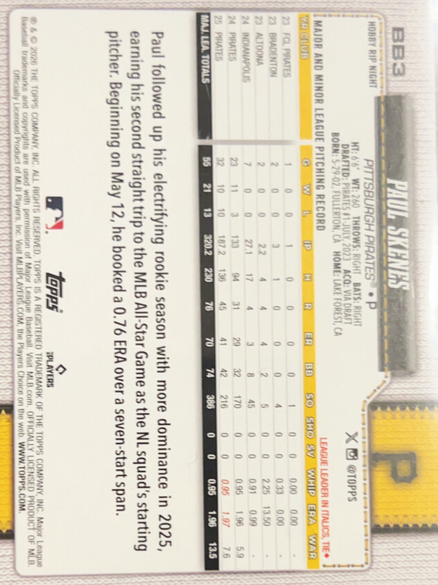 You are purchasing a 2026 Topps Rip Night Paul Skenes #BB3. You will receive the exact item in the photographs. Thank you for looking.
