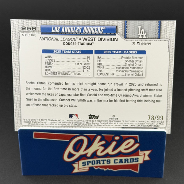 You are purchasing a 2026 Topps Series One Yoshinobu Yamamoto Shohei Ohtani Blake Snell Roki Sasaki Will Smith Freddie Freeman #256 Green Crackle /99. You will receive the exact item in the photographs. Thank you for looking.