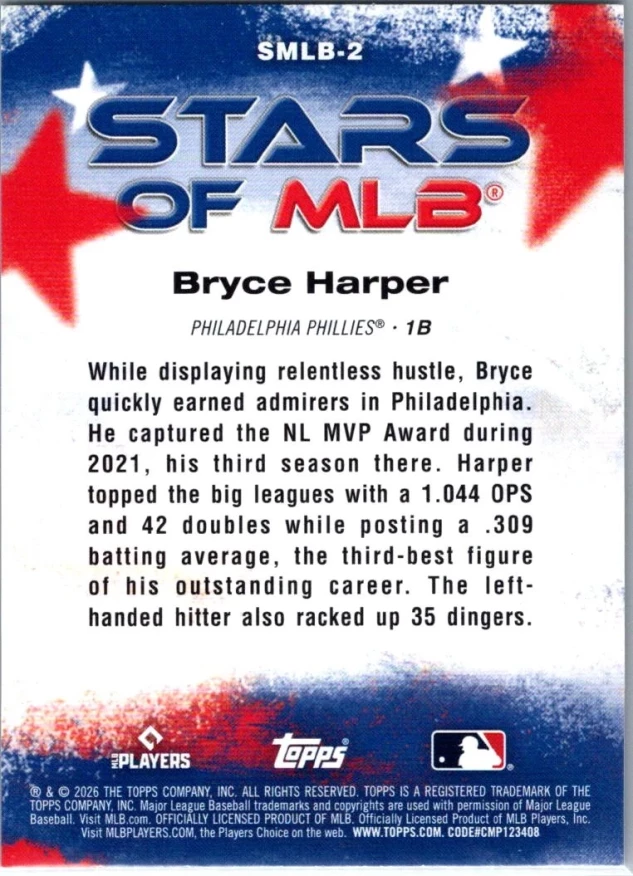 This is a nice example of a 2026 Topps #SMLB-2 Bryce Harper Stars of MLB