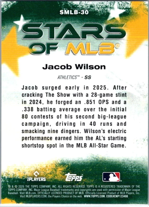 This is a nice example of a 2026 Topps #SMLB-30 Jacob Wilson Stars of MLB