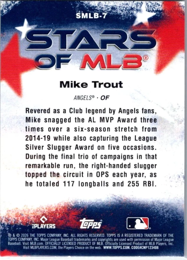 This is a nice example of a 2026 Topps #SMLB-7 Mike Trout Stars of MLB