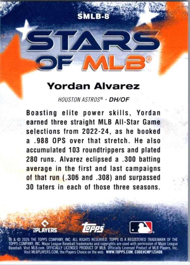 This is a nice example of a 2026 Topps #SMLB-8 Yordan Alvarez Stars of MLB