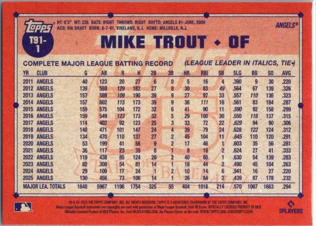 This is a nice example of a 2026 Topps #T91-1 Mike Trout 1991 Topps Baseball 35th Anniversary (Series One)