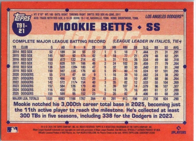 This is a nice example of a 2026 Topps #T91-21 Mookie Betts 1991 Topps Baseball 35th Anniversary (Series One)