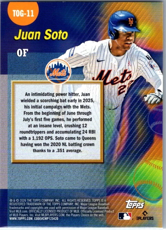 This is a nice example of a 2026 Topps #TOG-11 Juan Soto Titans of the Game