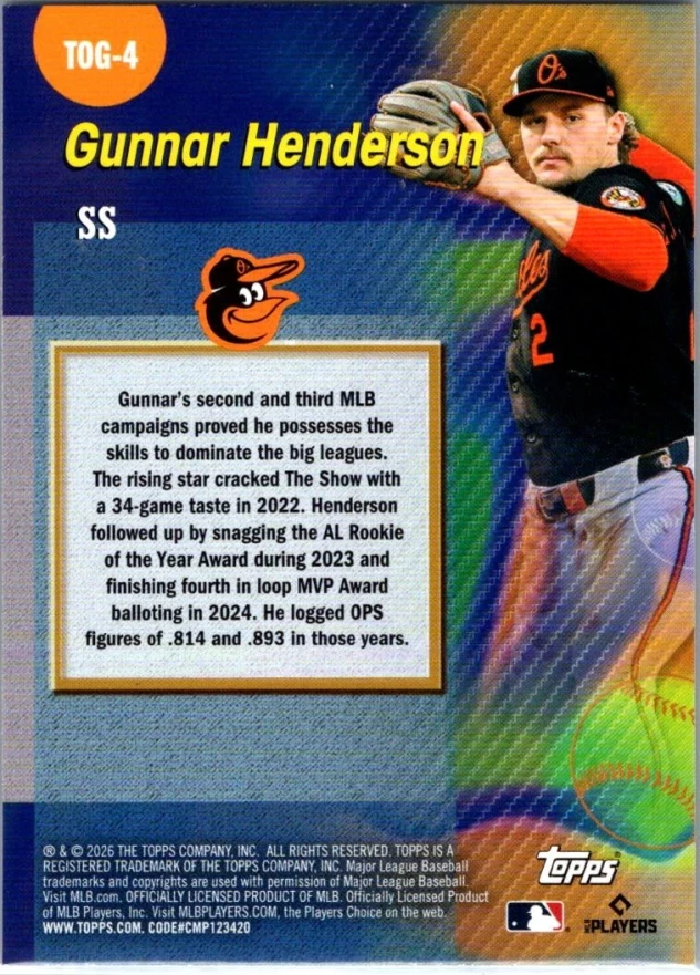 This is a nice example of a 2026 Topps #TOG-4 Gunnar Henderson Titans of the Game