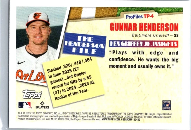 This is a nice example of a 2026 Topps #TP-4 Gunnar Henderson Topps Profiles