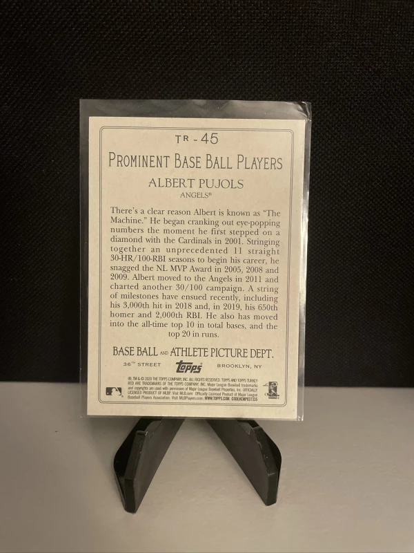 This Albert Pujols baseball card is a must-have for any MLB fan! Produced by Topps in 2020, this original Turkey Red card features the iconic player in his Los Angeles Angels uniform. The card is made of high-quality card stock and has a standard size of 2.5 x 3.5 inches.