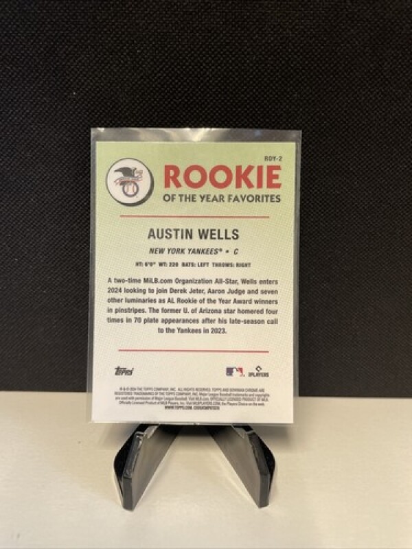 This is a highly sought-after 2024 Bowman Mega Box Rookie of the Year Favorites #ROY-2 trading card featuring Austin Wells of the New York Yankees. The card is made of high-quality card stock and is an original, licensed reprint. It is a retail green parallel/variety card and is part of the 2024 Bowman set.