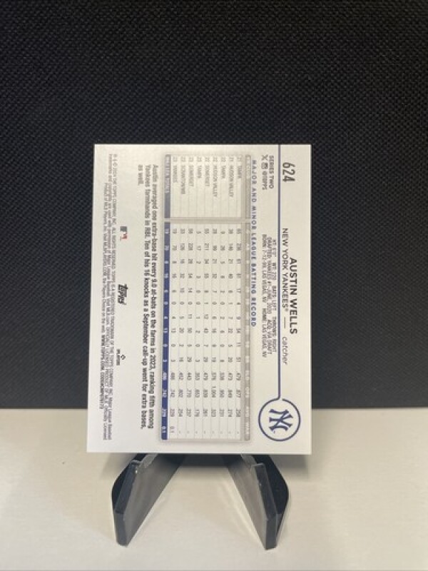 This is a 2024 Topps baseball trading card featuring Austin Wells, a rookie player for the New York Yankees. The card is made of high-quality card stock material and is an original print from the United States. It belongs to the base set and has the card number 624.