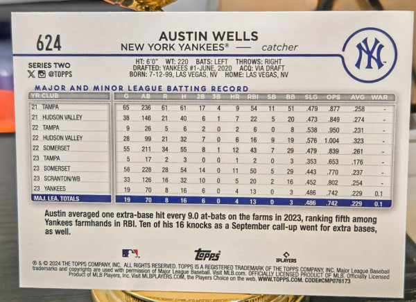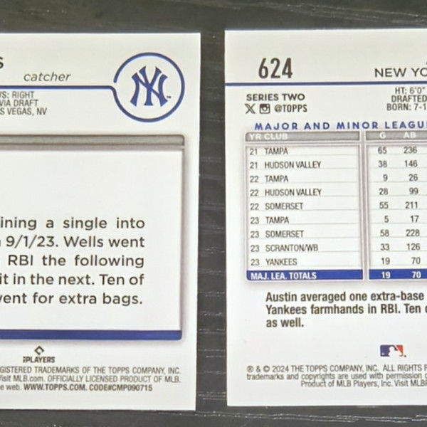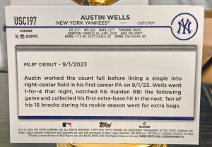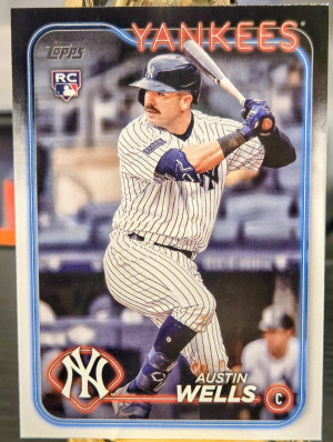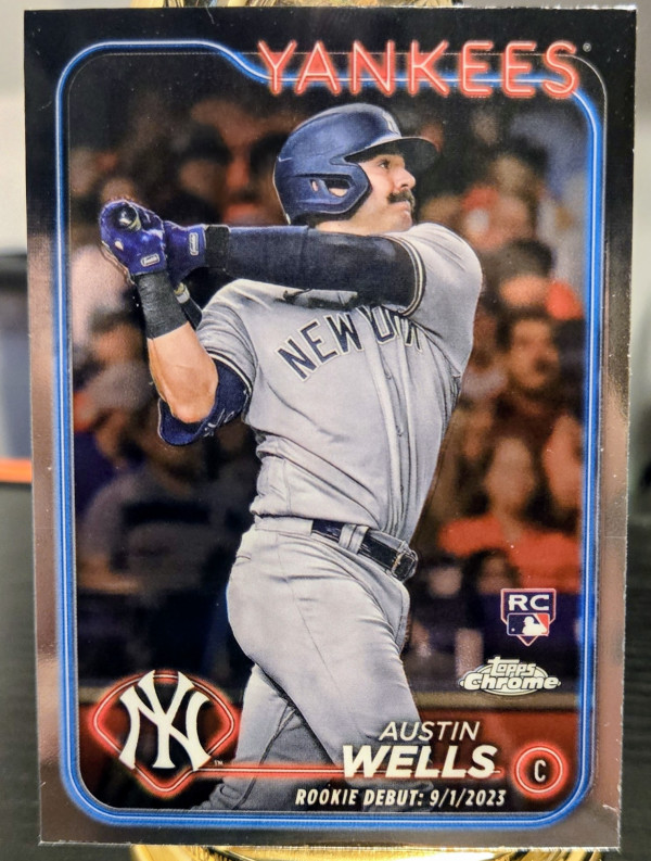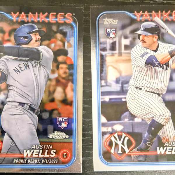 The product is a set of two 2024 Topps Chrome Rookie Debut trading cards featuring Austin Wells of the New York Yankees. These standard-sized baseball cards are made of card stock and are original licensed prints manufactured by Topps in the United States. The rookie cards are in English and belong to the Major League Baseball league. Perfect for collectors and fans of the sport, these cards capture a promising player's debut in the MLB.