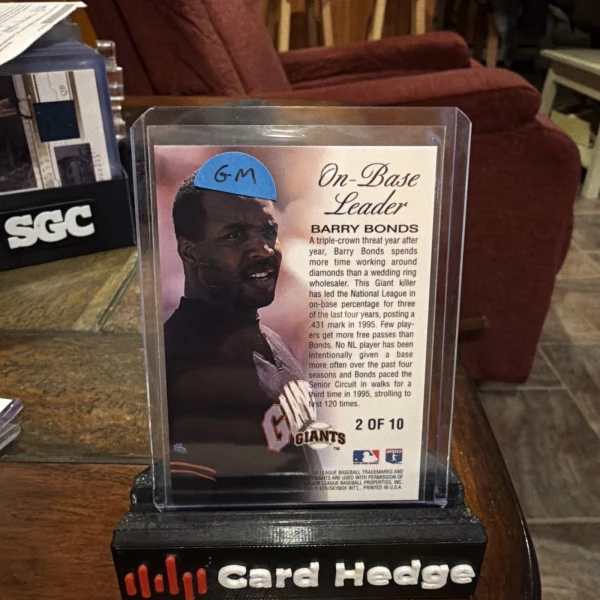 The product is a 1996 Fleer Ultra On-Base Leaders Gold Medallion trading card featuring Major League Baseball player Barry Bonds. This original card is part of the On-Base Leaders insert set and is manufactured by Fleer. The card is in English and showcases Bonds as the #2 on-base leader for the 1996 season with the San Francisco Giants. It is a standard-sized card made of card stock, making it a valuable collectible for baseball fans and card enthusiasts.