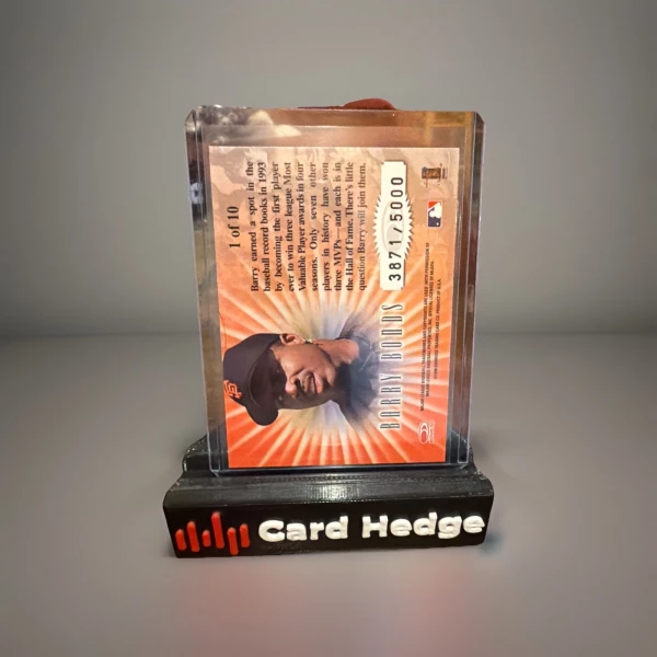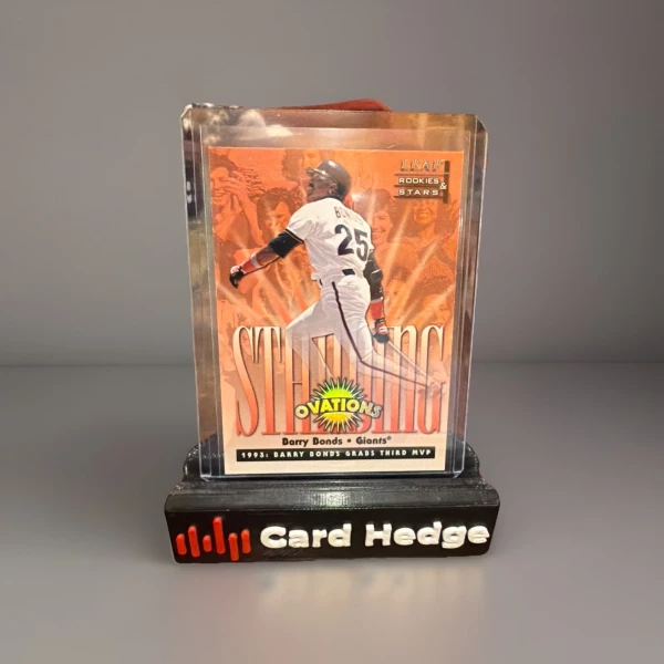 The product is a 1998 Leaf Rookies and Stars Standing Ovations #1 trading card featuring Major League Baseball player Barry Bonds. This original card is part of a limited print run of 5000 and is made of card stock. It is a standard-sized sports trading card with English language text and is an insert in the set. The card is not autographed and is not vintage, showcasing Bonds in his San Francisco Giants uniform from the 1998 season. It is a valuable collectible for fans of baseball and trading card enthusiasts.