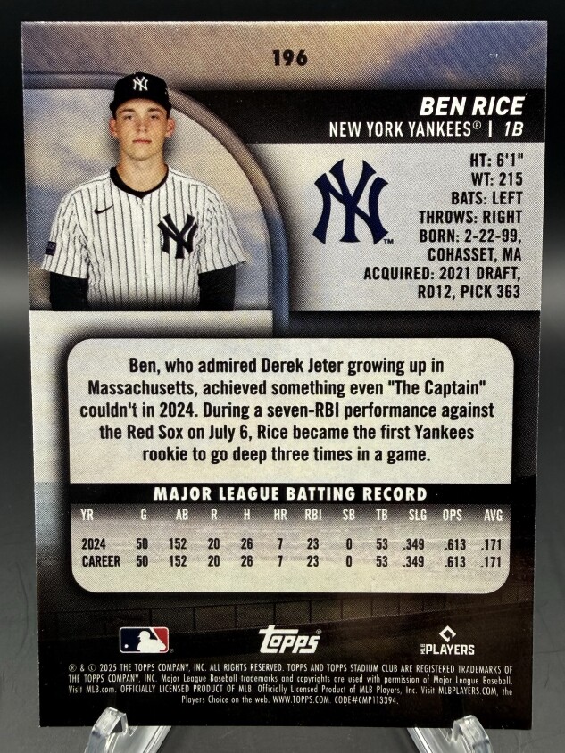 Ben Rice 2025 Topps Stadium Club Blue RC #196