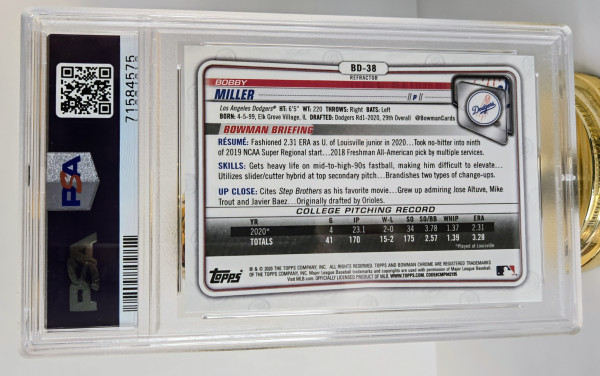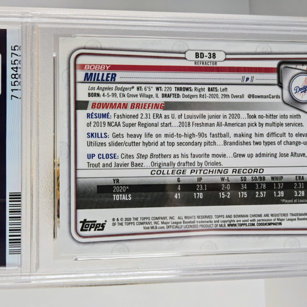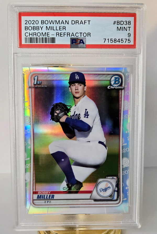 The product is a 2020 Bowman Draft Chrome 1st Bowman Refractor trading card featuring baseball player Bobby Miller from the Los Angeles Dodgers. This PSA 9 graded card is a part of the 2020 Bowman Draft set by Topps, known for its quality and sought-after rookie cards. The refractor parallel adds a unique shine to the card, making it a desirable collectible for fans and collectors of Major League Baseball memorabilia.