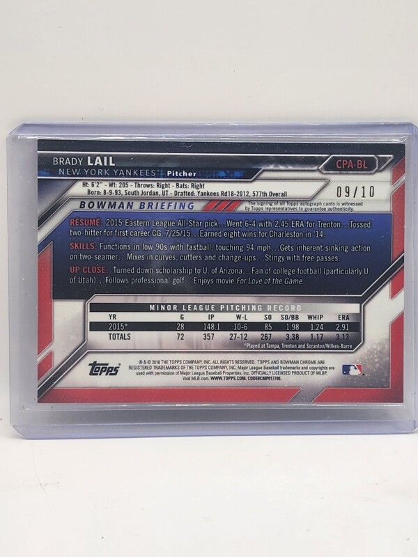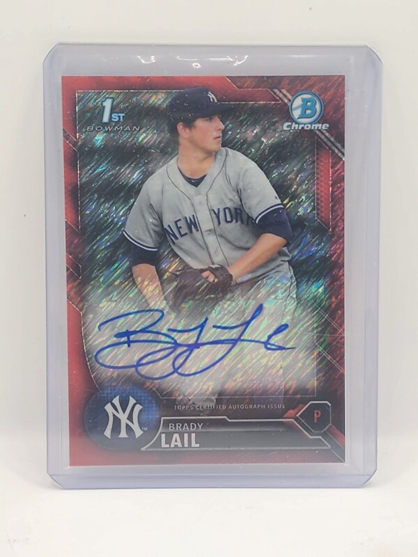 The product is a highly sought-after Brady Lail 2016 Bowman Chrome 1st Bowman Red Shimmer Auto sports trading card, featuring his autograph hand-signed on card stock. This limited edition card is part of a print run of only 10 copies, making it a rare and valuable collectible for fans of Major League Baseball and the New York Yankees. Manufactured by Topps in the United States, this English-language card is a must-have for collectors of sports trading cards, especially those interested in rookie cards and unique parallel varieties like the Red Shimmer design.