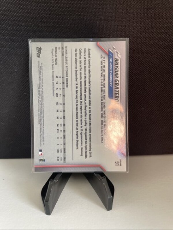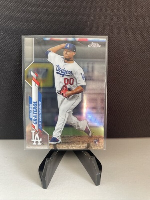 This is a 2020 Topps Chrome trading card featuring Brusdar Graterol, a rookie player for the Los Angeles Dodgers. The card is made of high-quality card stock and has a base parallel/variety. It is an original card and not a licensed reprint.