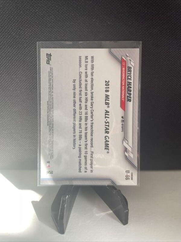 This 2020 Topps Chrome Update card features Bryce Harper, player for the Washington Nationals in Major League Baseball. The card is made of high-quality card stock and is an original, not a licensed reprint. It is part of the base set and has the card number U-66.