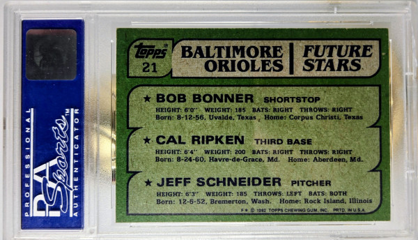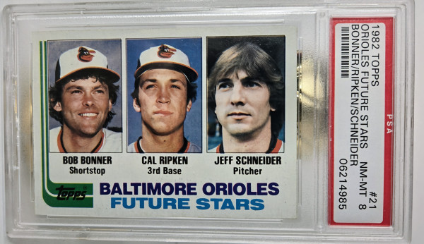 The product is a PSA 8 1982 Topps Future Stars #21 trading card featuring Rookie players from the Baltimore Orioles including Cal Ripken, Jeff Schneider, and Bobby Bonner. This baseball card is from the Major League Baseball (MLB) season of 1982 and is part of the 1982 Topps set by manufacturer Topps. A valuable collectible for fans of baseball and the Orioles team, this card showcases the future stars of the sport during the 1980s.