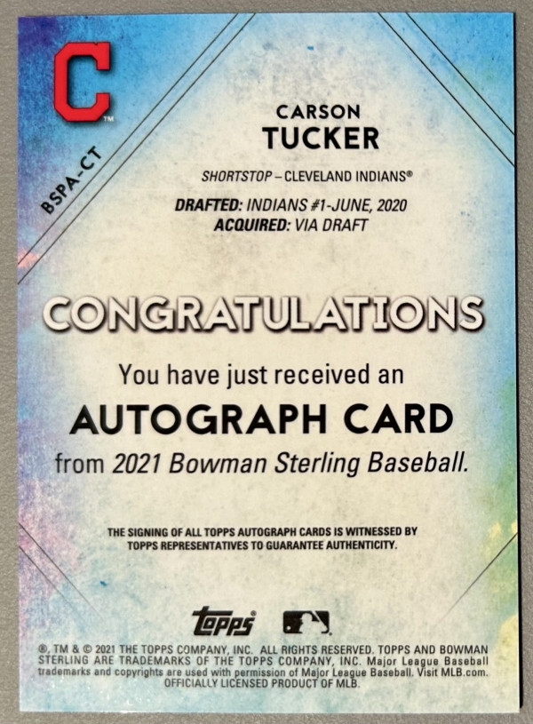 Carson Tucker 2021 Bowman Sterling Auto #BSPA-CT Cleveland Guardians