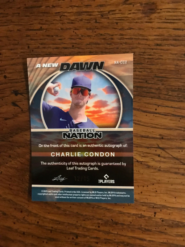 Charlie Condon Autograph. Numbered 12/15. 2025 Leaf Baseball Nation