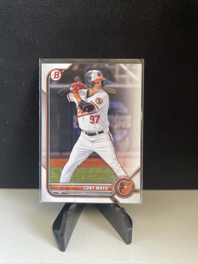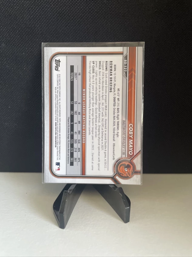This Coby Mayo 2022 Bowman Draft #BD-127 baseball trading card is a perfect addition to any collection. Featuring a standard card size and made of high-quality card stock material, this original Topps base set card showcases Mayo in his Baltimore Orioles uniform. The card is part of the 2022 Bowman Draft set and has a card number of BD-127.