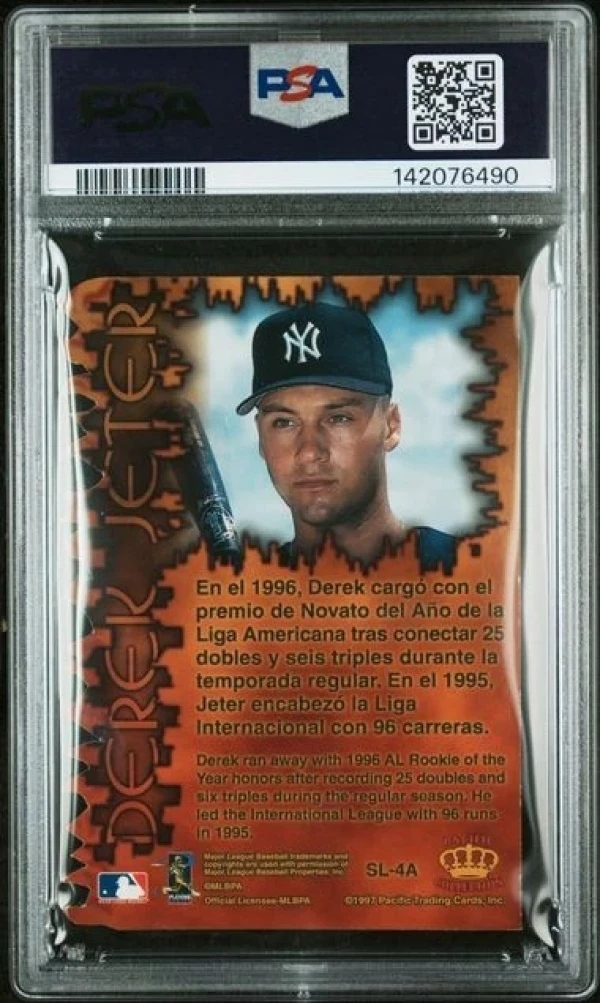 The product is a 1997 Pacific Invincible Sizzling Lumber #4A trading card featuring Derek Jeter of the New York Yankees. This original baseball card is made of card stock and is a die-cut variety from the 1997 set. Graded by Professional Sports Authenticator (PSA) and labeled as a PSA 7, this English-language sports trading card is a sought-after collectible for fans and collectors of Major League Baseball memorabilia.