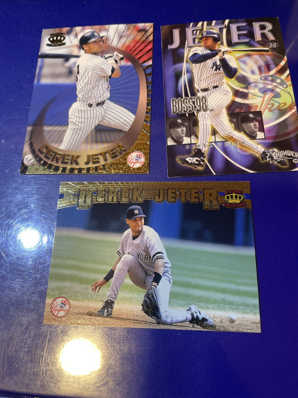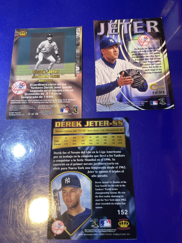 Three cool Jeter cards! Both Pacific cards are in Spanish. And English. Two 1997 Pacific collection one 98 thunder/skybox.