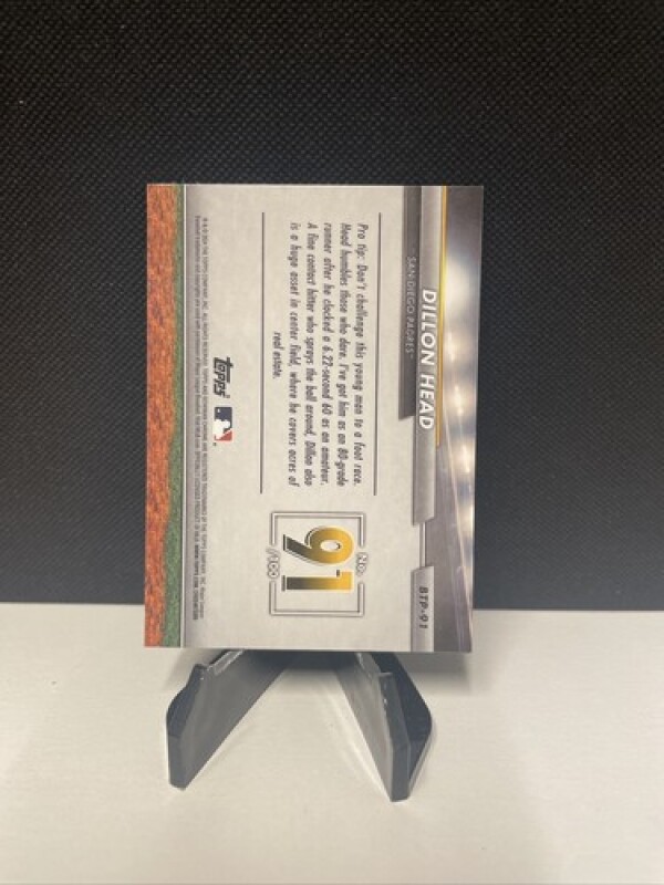 This 2024 Bowman Chrome Top Prospects trading card features Dillon Head, a promising player for the San Diego Padres. With a sleek chrome finish and a unique insert, this card is a must-have for any Major League Baseball fan. The card is made from high-quality card stock and is an original, licensed reprint from the Topps manufacturer.