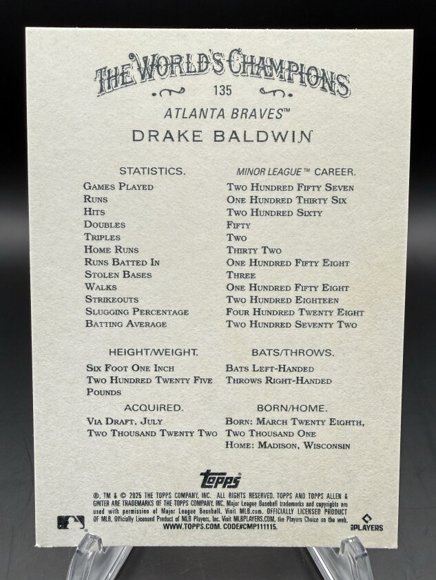 Drake Baldwin 2025 Topps Allen & Ginter RC #135