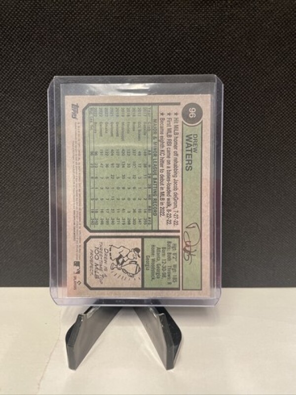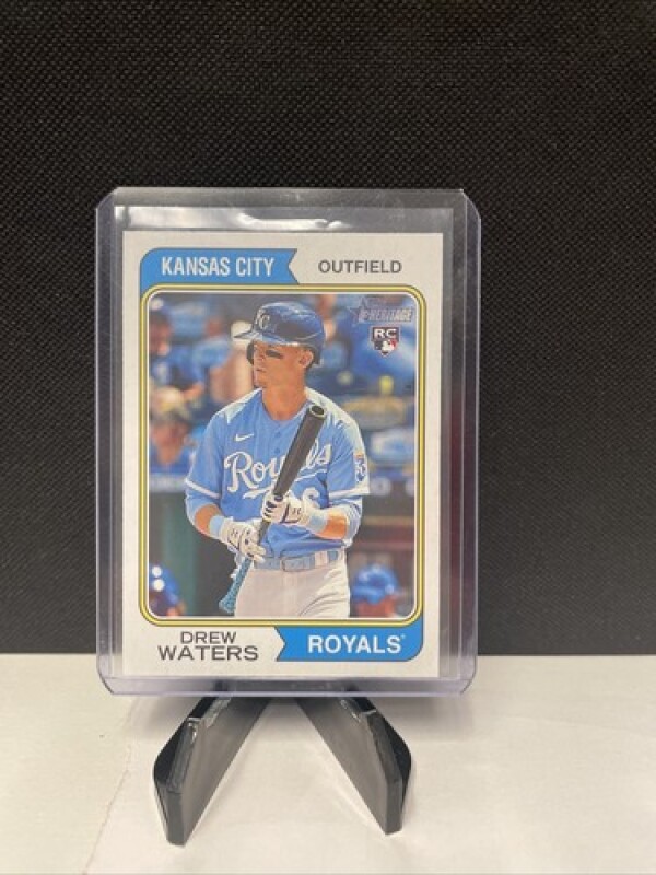 This is a 2023 Topps Heritage sports trading card featuring Drew Waters of the Kansas City Royals. The card is made of card stock and is an original Topps production. It is a base set rookie card with the card number 96. The card is standard size and is not autographed.