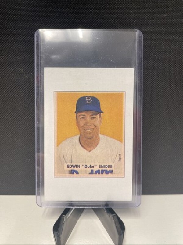 This is a 1989 Bowman Inserts 1949 Reprint trading card featuring Duke Snider of the Brooklyn Dodgers. The card is a licensed reprint of the original 1949 design, made of card stock. It is a standard size Major League Baseball card, part of the Bowman set, and does not include an autograph. A parallel/base variety, it showcases Duke Snider as a player from the 1949 season, manufactured in the United States.