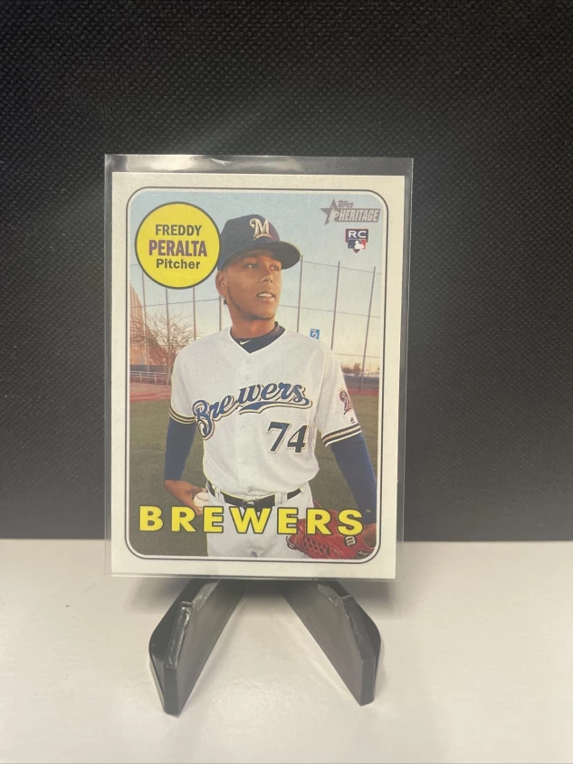 This is a 2018 Topps Heritage #541 RC trading card of Milwaukee Brewers player Freddy Peralta. It features a standard size card made of card stock material, with an original print and licensed by Topps. The card is not autographed and is not a vintage reprint. It is part of the 2018 set of Topps Heritage baseball cards, with the rookie feature and parallel variety of "Base". The card was manufactured in the United States and is a great addition to any baseball enthusiast's collection.