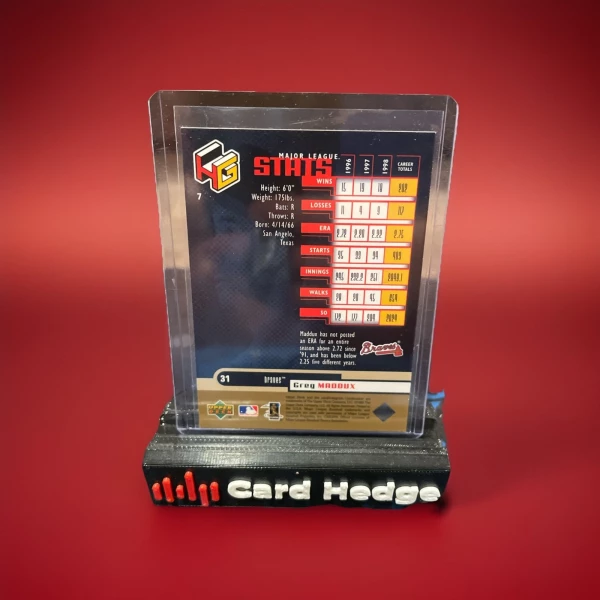 The product is a 1999 Upper Deck HoloGrFx trading card featuring Major League Baseball player Greg Maddux from the Atlanta Braves. This original card is made of card stock and is part of the HoloGrFx set. The card is a parallel/variety called "Ausome" and is in English language. It is a standard size sports trading card that is not autographed and was manufactured in the United States. This collectible item showcases Maddux during the 1999 season and is a sought-after piece for fans and collectors of baseball memorabilia.