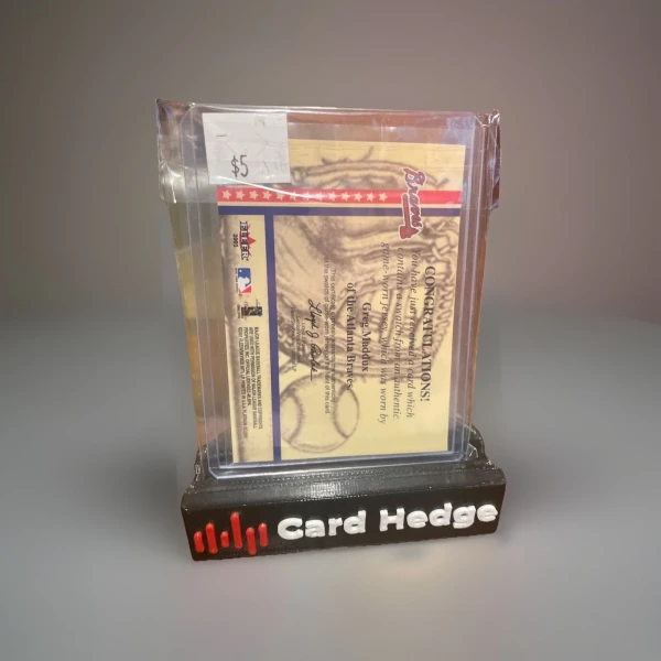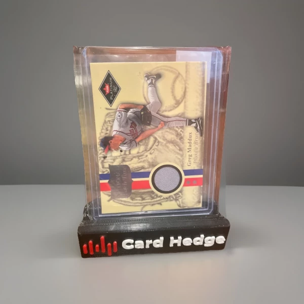 The Greg Maddux 2001 Fleer Platinum National Patch Time trading card is a collectible sports memorabilia piece featuring a patch of the Major League (MLB) player's jersey. Manufactured by Fleer in 2001, this original English-language card is part of the 2001 Fleer Platinum set and showcases Greg Maddux in his Atlanta Braves uniform. This insert card is a valuable addition for fans and collectors looking to commemorate the baseball legend.