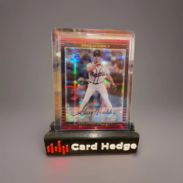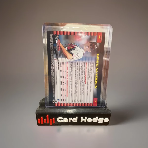 The product is a 2002 Bowman Chrome #35 X-Fractor /250 trading card featuring Greg Maddux of the Atlanta Braves. This original card is made of card stock and is part of the 2002 Bowman Chrome set manufactured by Topps. The X-Fractor parallel adds a unique and collectible element to the card, making it a sought-after item for fans and collectors of Major League Baseball trading cards. With only 250 copies produced, this limited edition card is a valuable addition to any sports memorabilia collection.