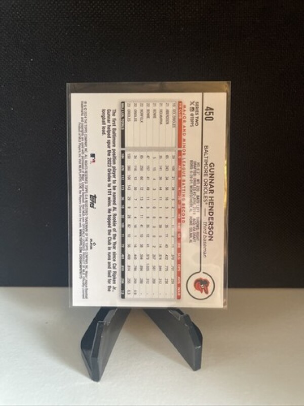 This is a 2024 Topps baseball trading card featuring Gunnar Henderson of the Baltimore Orioles team. The card is made of card stock material and is a standard size. It is an original, base set card with the card number 450. The card is not autographed and is not a vintage reprint. It is part of the Major League (MLB) league and was manufactured in the United States. The set is a sports trading card and is the base variety. The card is in excellent condition and is a great addition to any collection.