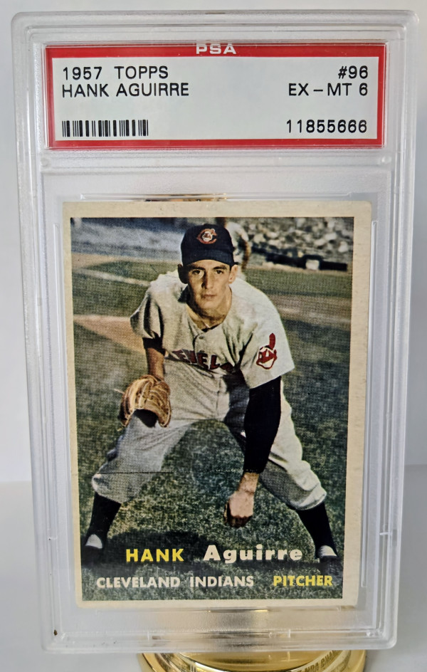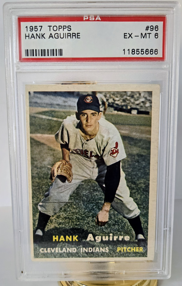 The product is a 1957 Topps baseball trading card featuring Hank Aguirre of the Cleveland Guardians (formerly Indians). This vintage card is part of the base set for that season and is manufactured by Topps. It is a single card with the card number 96, depicting Aguirre during his time playing in the Major League Baseball. This collectible item is a must-have for fans and collectors of baseball memorabilia, showcasing a piece of history from the 1957 season.