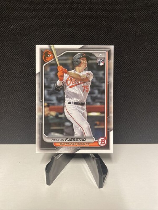 This is a 2024 Bowman sports trading card featuring Heston Kjerstad, rookie player for the Baltimore Orioles in Major League Baseball. The card is made of card stock material and is an original, not a licensed reprint. It has a base set and rookie features, with a card number of 9. The card is in standard size and was manufactured by Topps in the United States. This card is a great addition to any baseball fan's collection.