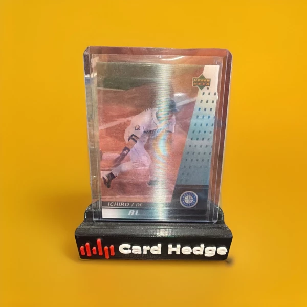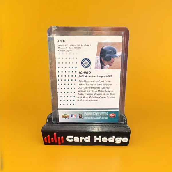 The product is a 2003 Upper Deck Post Cereal trading card featuring Ichiro Suzuki of the Seattle Mariners. This original card is part of the MVP Action set and is made of card stock. It showcases a lenticular design and is part of the base parallel/variety. The card is in English and is a valuable collectible item for fans of Major League Baseball and Ichiro Suzuki.