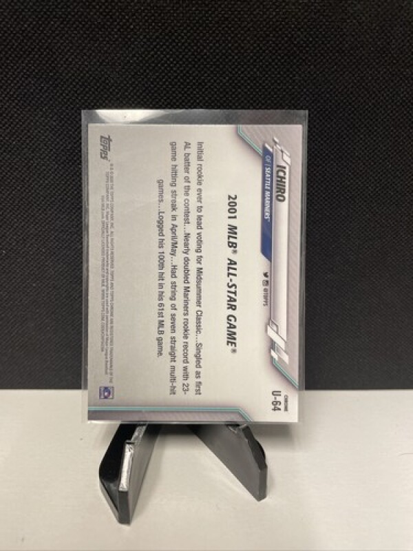 This is a 2020 Topps Chrome Update trading card featuring Ichiro Suzuki, a Major League Baseball player for the Seattle Mariners. The card is part of the All-Star Game parallel variety and has the card number U-64. It is an original, English-language sports trading card made of card stock material, with no autograph or vintage features. The card is an excellent addition to any collection and was manufactured in the United States by Topps.