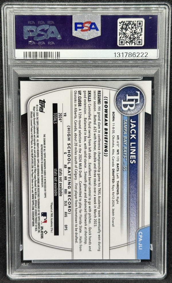 Jack Lines 2025 Bowman Chrome 1st #CPA-JLI Auto Speckle Refractor 214/299 PSA 9
