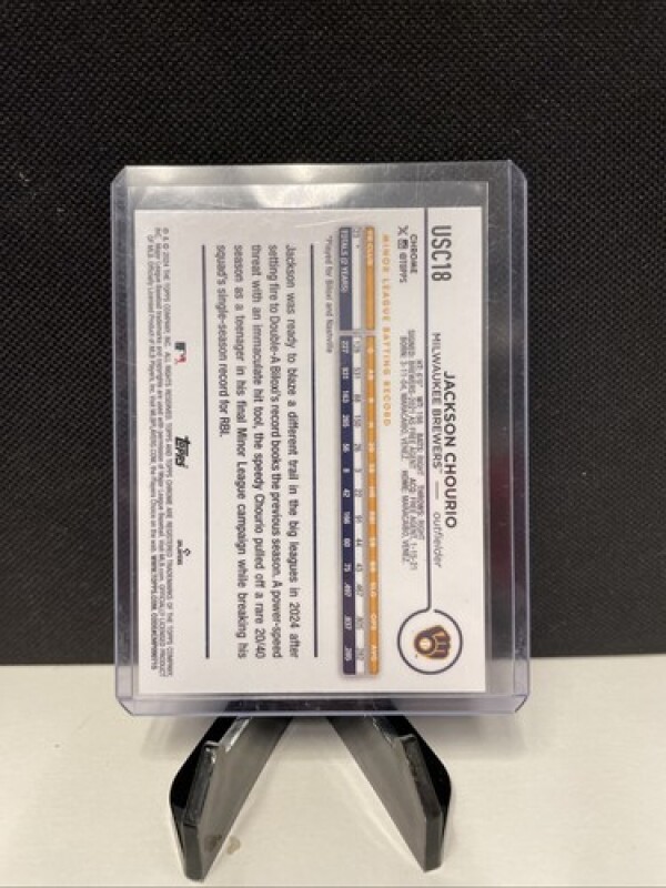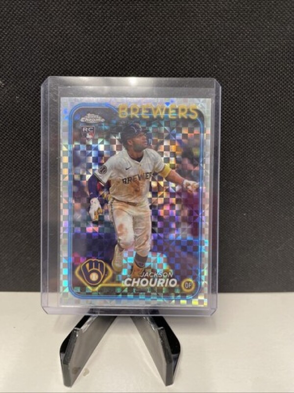 This is a 2024 Topps Chrome Update X-Fractor Rookie Card of Jackson Chourio from the Milwaukee Brewers. The card is an original, licensed reprint made of card stock, featuring a parallel variety design. It is a Major League Baseball (MLB) sports trading card with the card number USC18, manufactured by Topps in the United States.